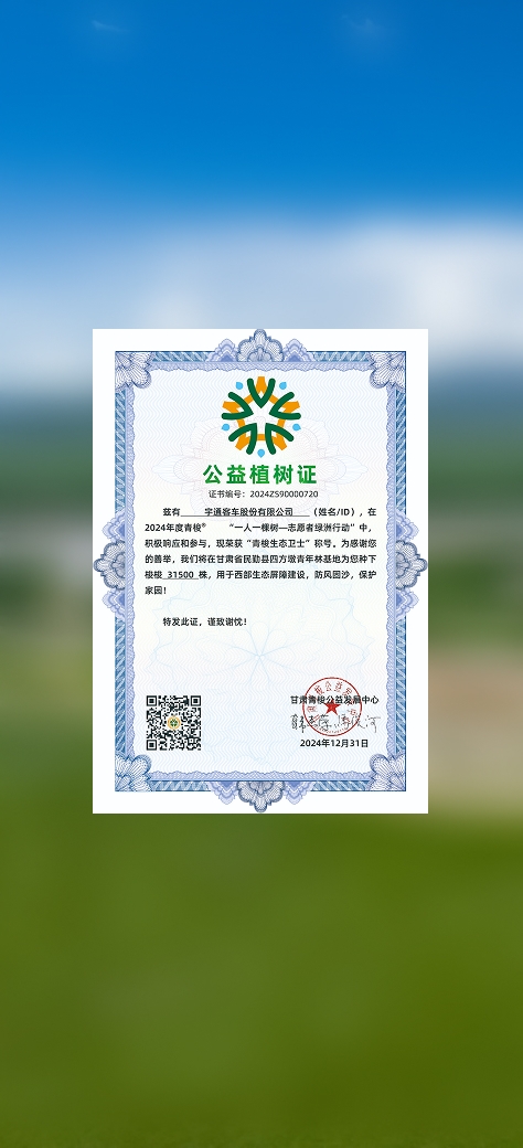 Il 22 aprile 2025 (Giornata Mondiale della Terra), Yutong ha tenuto l'evento di lancio globale della sua iniziativa "Foresta Net Zero" nella Foresta Ecologica di Sifangdun, nella Contea di Minqin, Città di Wuwei, Provincia di Gansu, dove il terzo deserto più grande della Cina, il Badain Jaran, incontra il quarto più grande, il Deserto del Tengger. Clienti di Yutong e rappresentanti dei media di tutto il mondo hanno partecipato ad attività come la costruzione di griglie erbose e la piantumazione di alberi di Haloxylon ammodendron, contribuendo collettivamente agli sforzi globali per la sostenibilità.